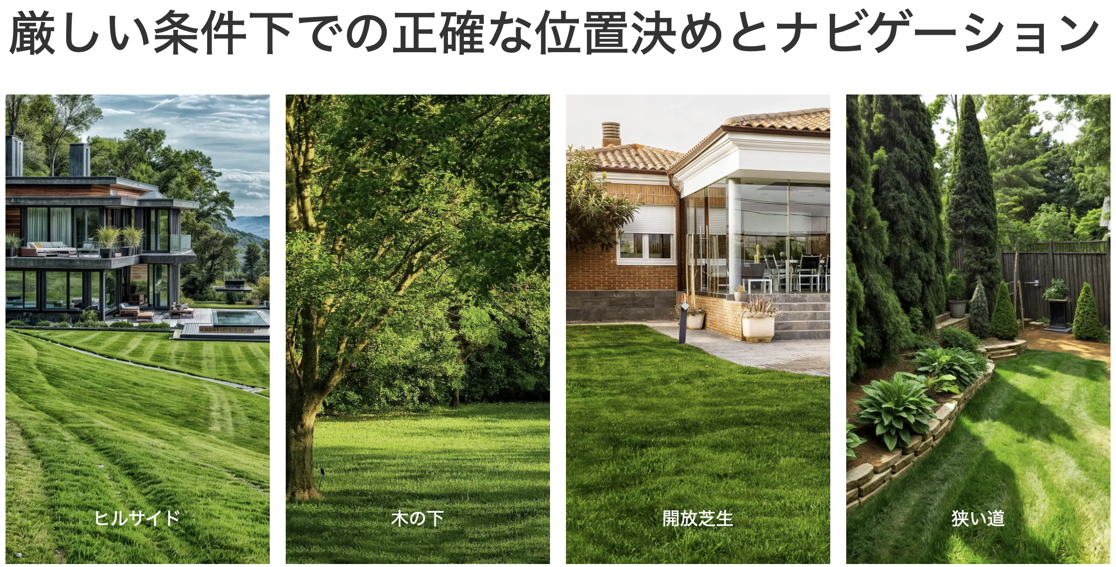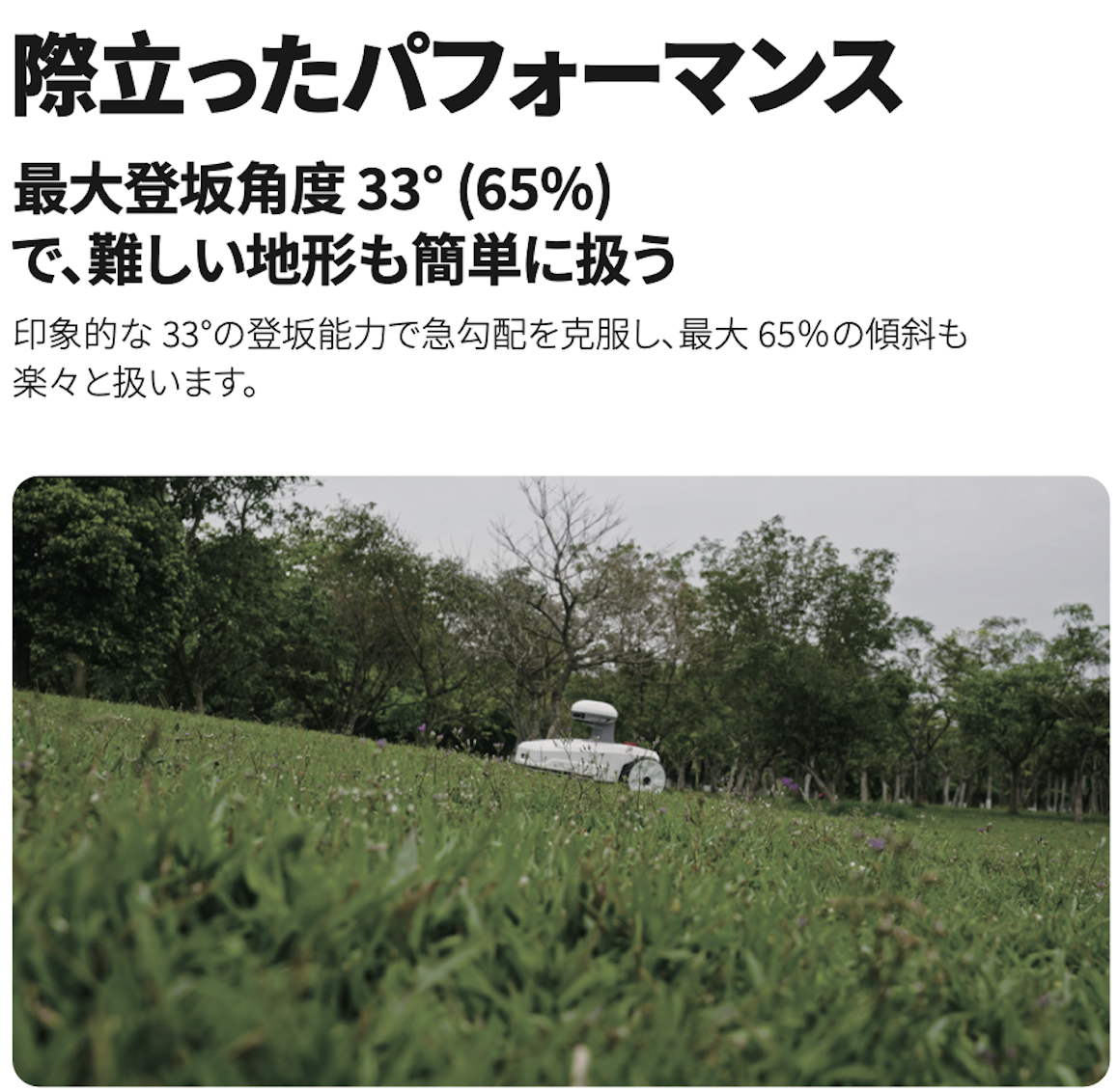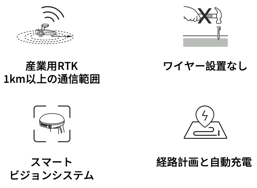 - 急傾斜40度対応:山林・堤防など危険エリアも自動走行